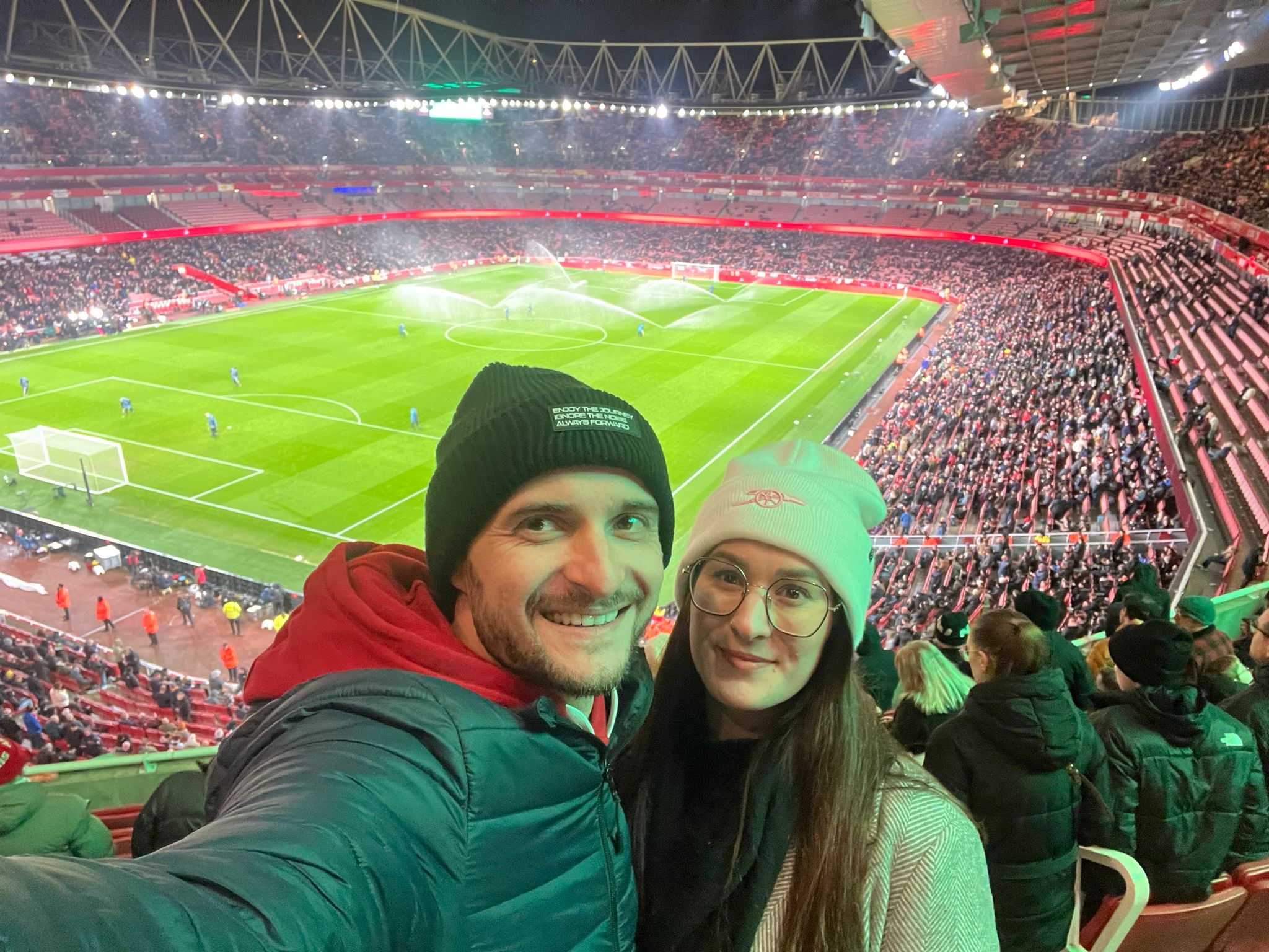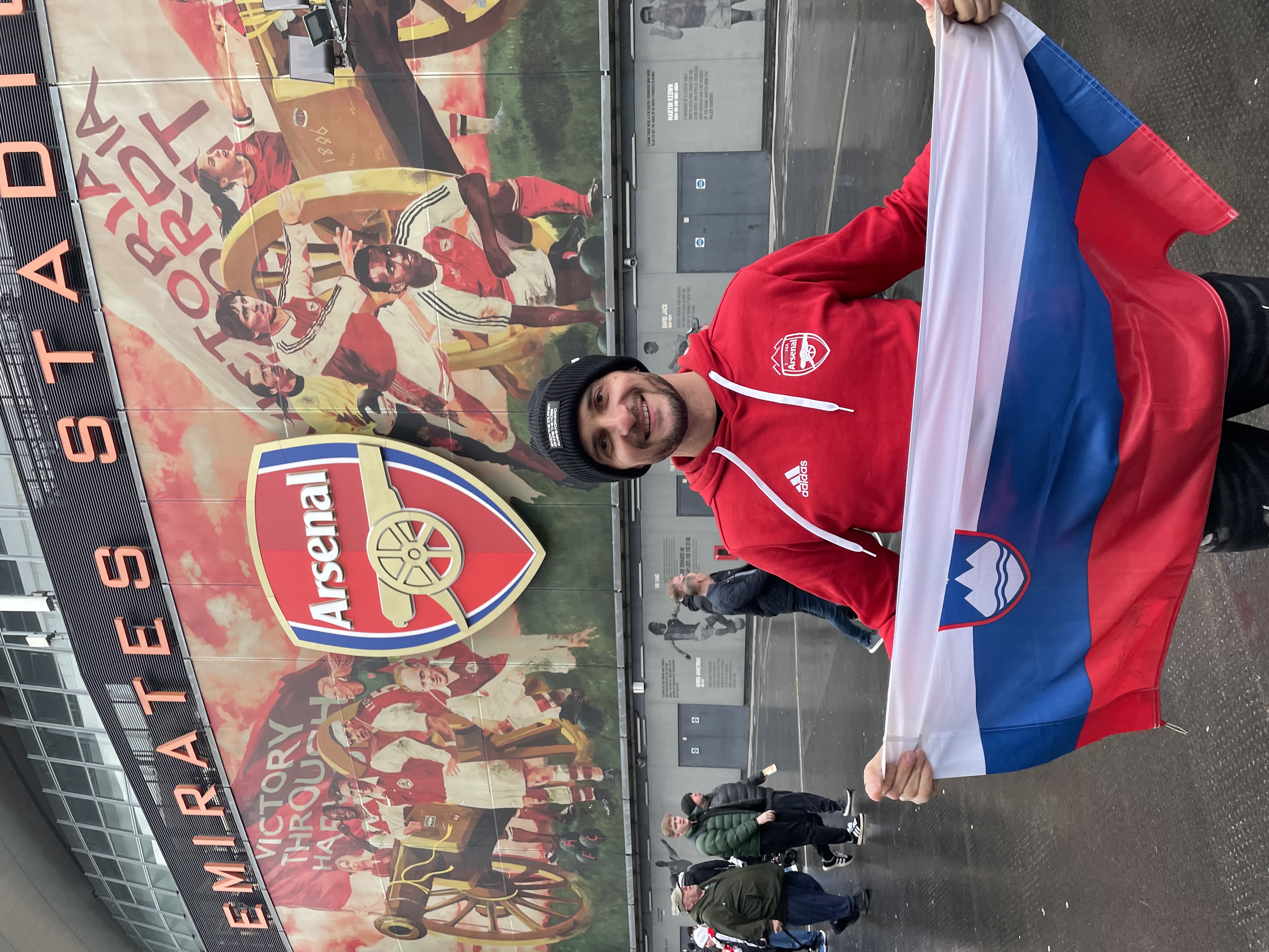In končno sva sedla na podzemno železnico ter se odpravila do postaje Arsenal. Takoj po prihodu iz postaje se je že čutil pridih nogometnega spektakla, ki ga ob gruči navijačev, ki se sprehajajo proti stadionu, pomagajo poustvariti stojnice z navijaškimi rekviziti ter hrano in pijačo. Pohitela sva mimo teh mikavnih stojnic, saj sva želela čim prej priti do stadiona, kjer sva ustvarila nekaj obveznih fotografij za spomin (tudi z novim puloverjem kluba Arsenal Slovenia). Ker sva bila na stadionu slabo uro pred začetkom tekme, sva lahko brez težav šla tudi do sprednjih vrst v spodnjem sektorju stadiona, ki so tik ob klopeh za rezervne igralce. Tako sva od blizu spremljala prihod igralcev na ogrevanje ter še zadnjo izjavo trenerja Manchester United-a Michael Carrick-a pred tekmo. Nekaj posebnega je doživeti to, da (velika) imena angleškega nogometa vidiš tako od blizu. Seveda pa je bil prav poseben občutek pozdraviti slovenskega igralca, četudi igra za velikega rivala. Benjamin Šeško se je na najine klice s tribune ter slovensko zastavo prav simpatično odzval, se nasmejal in dvignil roko. Imela sva namreč srečo, da so bili rezervni igralci United-a v tistem času na igrišču zelo blizu tribune, kjer sva bila pred začetkom tekme. Mislim, da sem o tem že pisal, in sicer zdi se mi res nenavadno (drugje po Evropi tega še nisem doživel), da lahko po stadionu prehajaš med tribunami in/ali sektorji, s tem pa prideš popolnoma v bližino igrišča. Čeprav vemo, da Benjamin rad deli avtograme, se je pa vseeno poznalo, da je šlo za njemu gostujočo tekmo, zato se ni preveč bližal tribunam, zato se ni odzval prošnjam za podpis na slovensko zastavo. Ampak nič za to, za to bo še možnost ob kakšni drugi priložnosti…