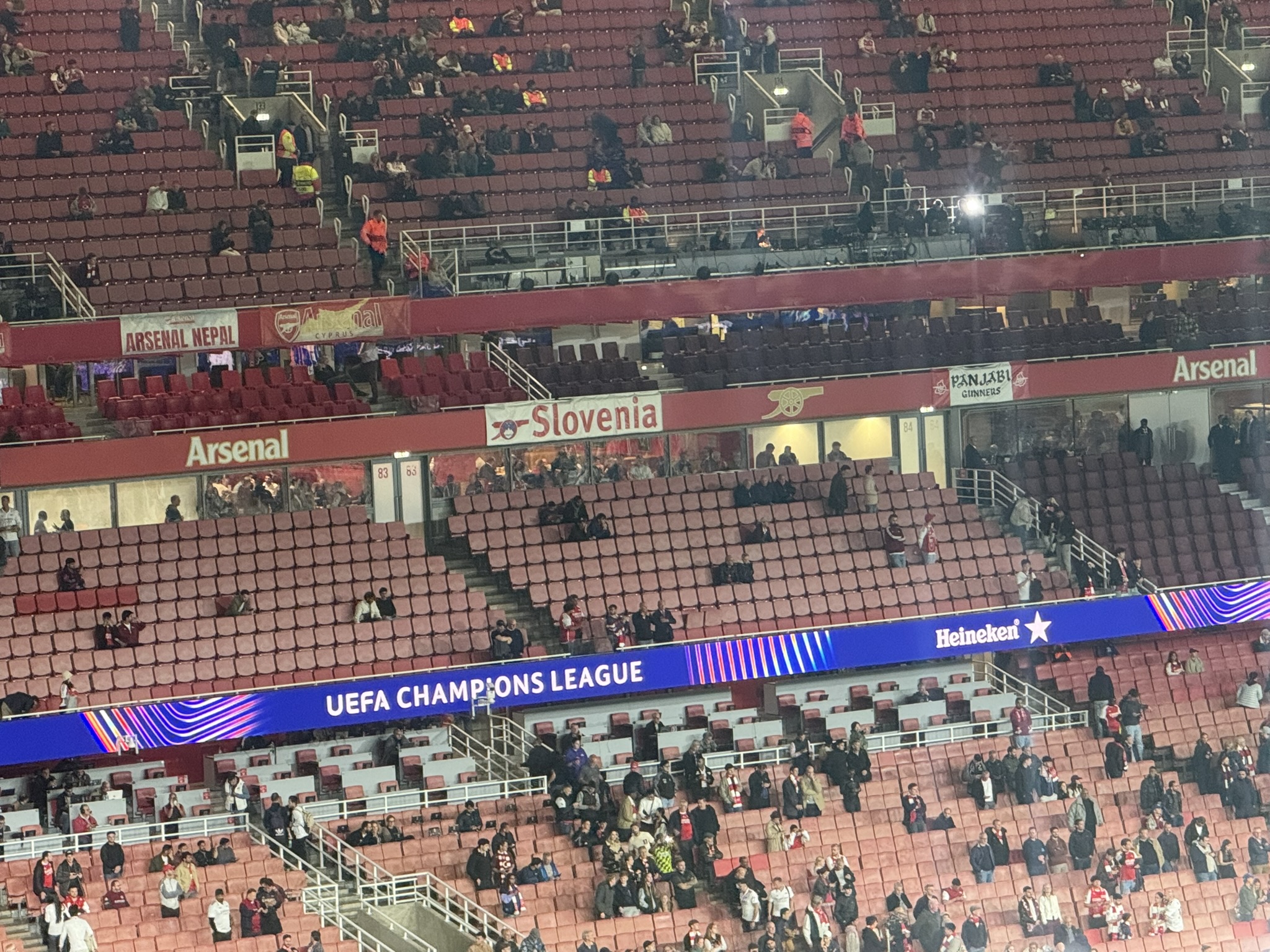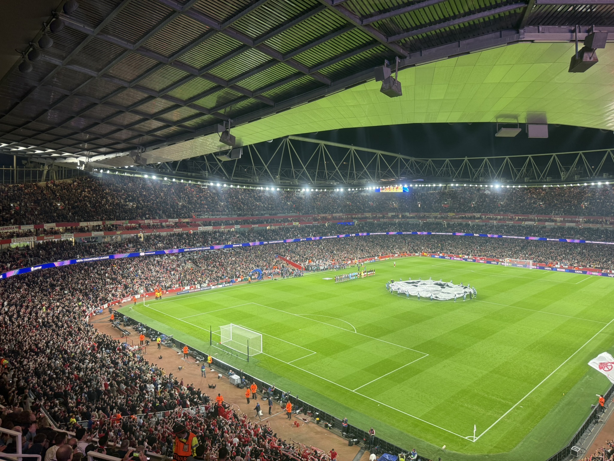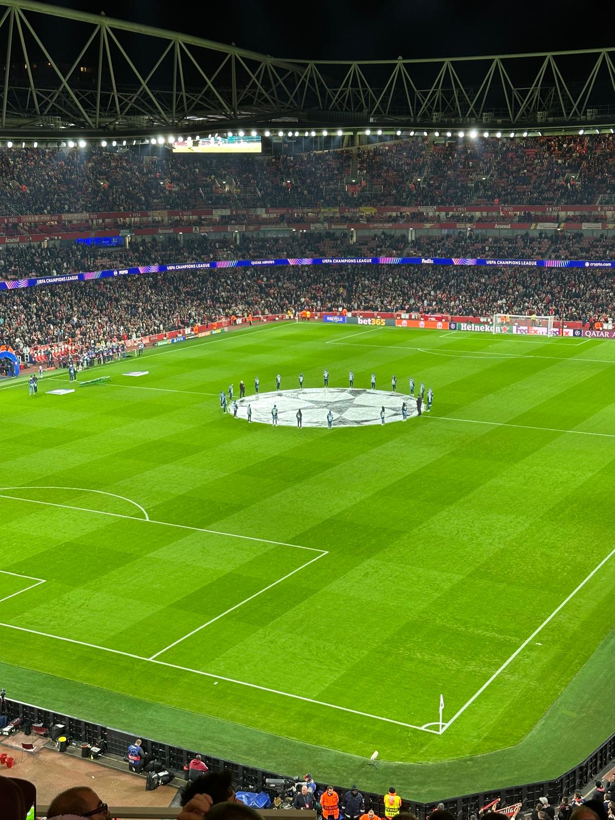 Ko smo prispeli na Emirates, je bil stadion že povsem živ. Tekmo si je po uradni statistiki ogledalo 56.820 gledalcev. Arsenalovi navijači so poskrbeli za glasen začetek, a pomembno je poudariti tudi nekaj drugega: navijači Olympiakosa so pripravili res izjemno vzdušje. Čeprav so bili številčno manjši, so petje, ritmični bobni in energične koreografije zapolnili svoj del stadiona in dali tekmi pravi evropski naboj. Njihovo glasno podporo je bilo slišati praktično celotno srečanje. Na stadionu je bilo prav lepo videt izobešen transparent z napisom "Arsenal Slovenija".