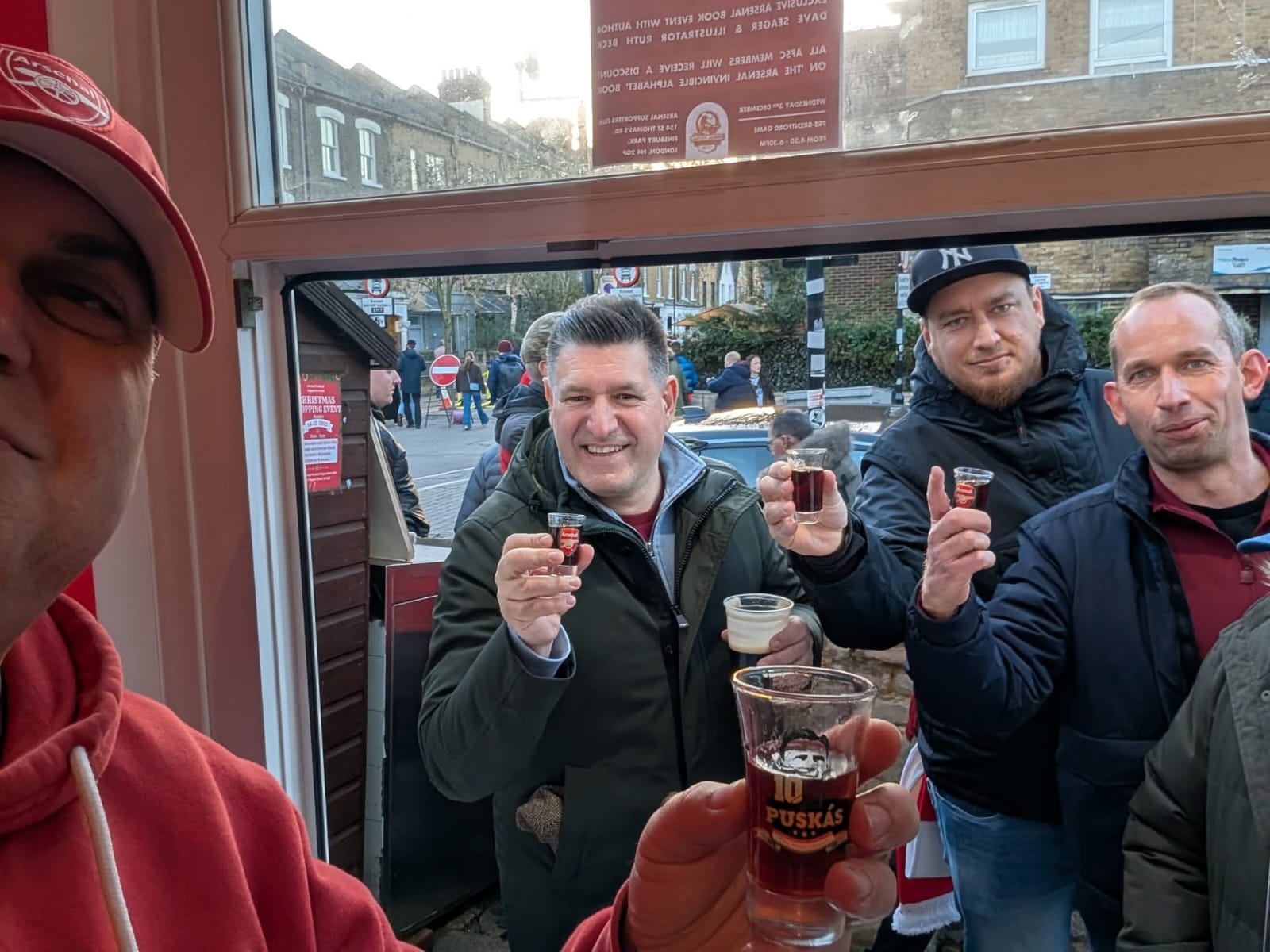 Še preden sva stopila proti stadionu, sva se znašla v družbi navijačev z vsega sveta – Arsenal Italia, Arsenal Bulgaria, Arsenal España … kot bi se zbrala cela globalna družina. Vsak je imel svojo zgodbo, vsak svoj razlog, zakaj je Arsenal tisti klub, ki mu bije srce, a vsi smo tisti dan dihali enako. Petje, objemi, skupne fotografije – energija je bila neverjetna.